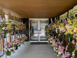 多くの祝花が並ぶエントランス。