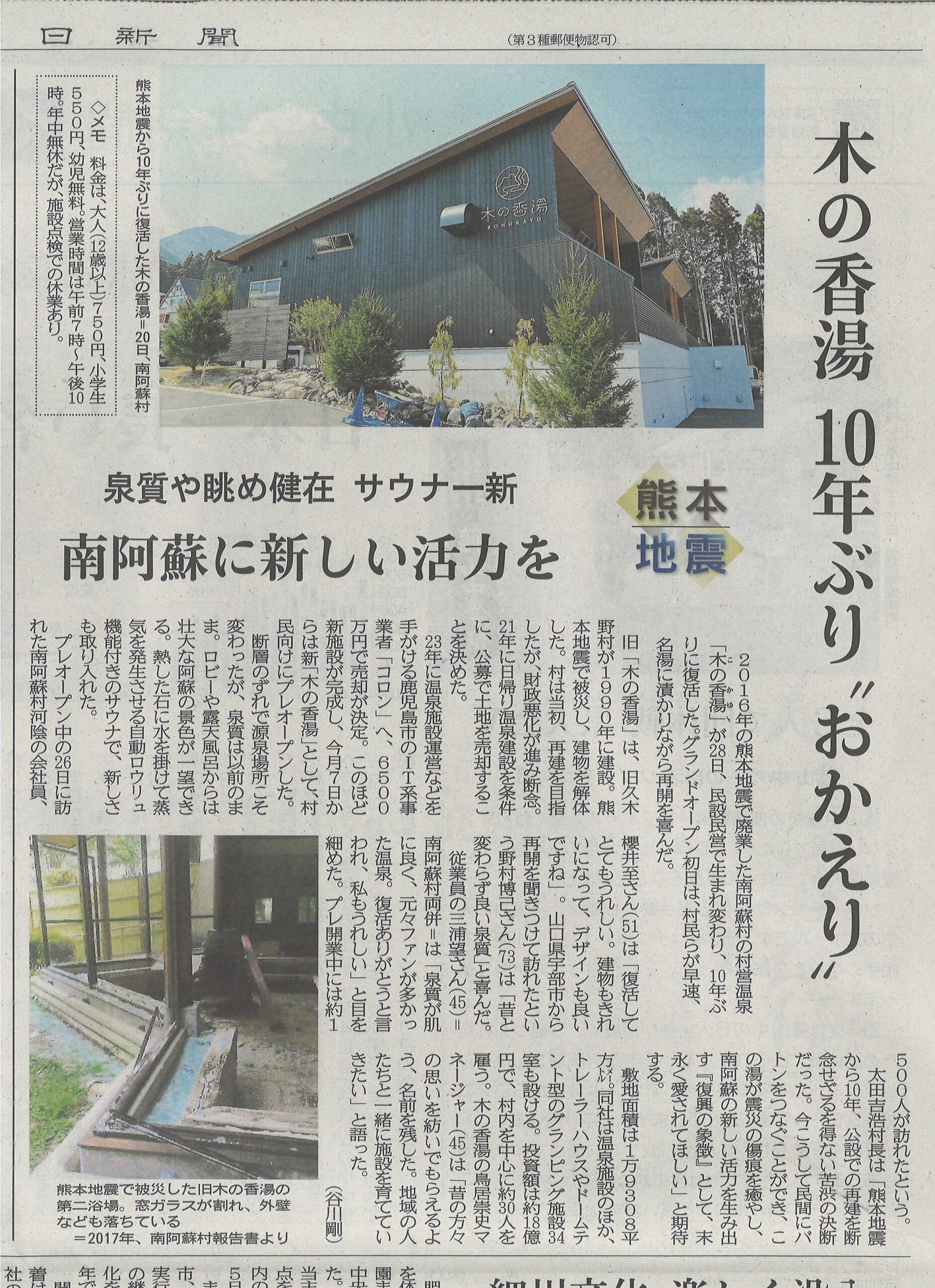 「木の香湯温泉」が、熊本日日新聞に掲載されました。